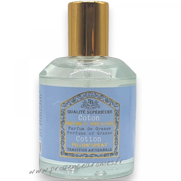 Brume d'oreiller Coton Un été en Provence. Vaporisateur le flacon de 50 ml parfum Coton à pulvériser sur l'oreiller, Un été en Provence. Une fragrance aux notes fines et délicates qui nous apporte ses effluves au charme délicieusement subtile et chaleureux.