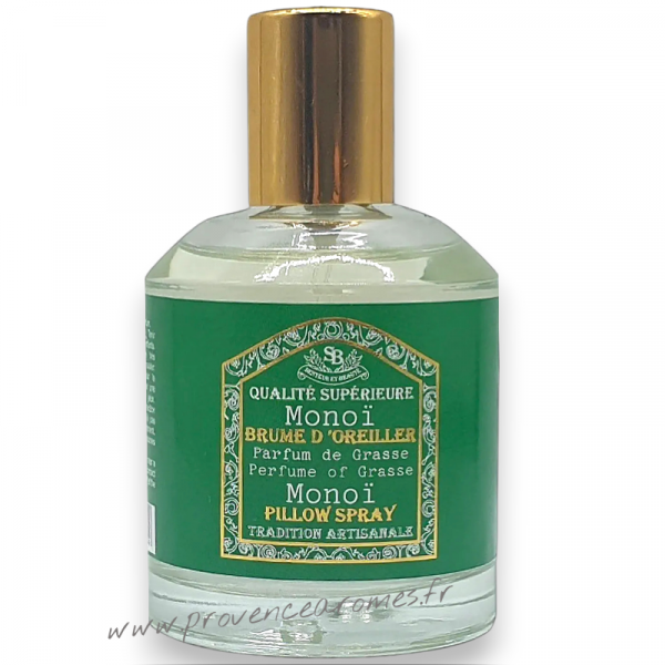 Brume d'oreiller Monoï Un été en Provence. Vaporisateur le flacon de 50 ml parfum à pulvériser sur l'oreiller, Un été en Provence. Une fragrance aux notes délicate qui nous apporte ses effluves au charme délicieux du Monoï et de la fleur de Tiaré qui invite au rêve et à la détente.