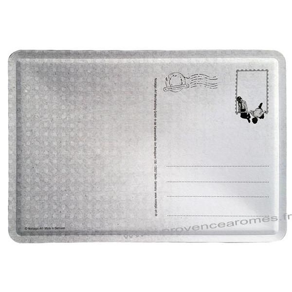 Plaque métal format carte postale Doublé papier au dos pour pouvoir écrire dessus. Livré avec une enveloppe